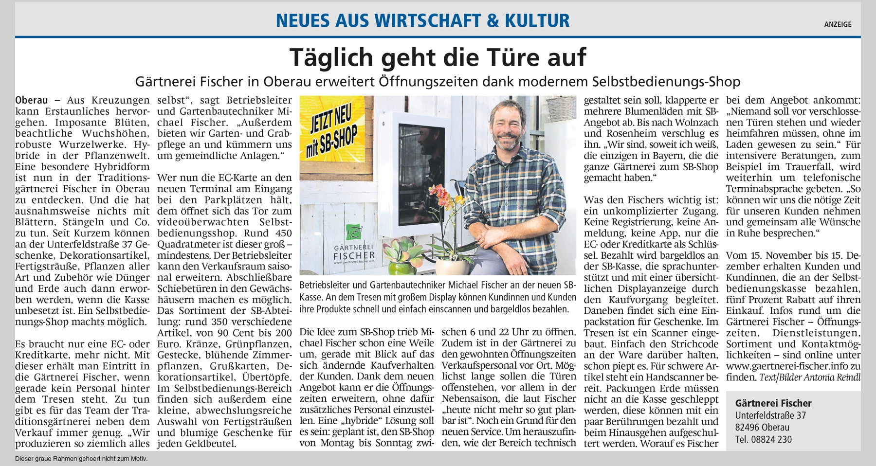 Oberau – Aus Kreuzungen kann Erstaunliches hervorgehen. Imposante Blüten, beachtliche Wuchshöhen, robuste Wurzelwerke. Hybride in der Pflanzenwelt. Eine besondere Hybridform ist nun in der Traditionsgärtnerei Fischer in Oberau zu entdecken. Und die hat ausnahmsweise nichts mit Blättern, Stängeln und Co. zu tun. Seit Kurzem können an der Unterfeldstraße 37 Geschenke, Dekorationsartikel, Fertigsträuße, Pflanzen aller Art und Zubehör wie Dünger und Erde auch dann erworben werden, wenn die Kasse unbesetzt ist. Ein Selbstbedienungs- Shop machts möglich. Es braucht nur eine EC- oder Kreditkarte, mehr nicht. Mit dieser erhält man Eintritt in die Gärtnerei Fischer, wenn gerade kein Personal hinter dem Tresen steht. Zu tun gibt es für das Team der Traditionsgärtnerei neben dem Verkauf immer genug. „Wir produzieren so ziemlich alles selbst“, sagt Betriebsleiter und Gartenbautechniker Michael Fischer. „Außerdem bieten wir Garten- und Grabpflege an und kümmern uns um gemeindliche Anlagen.“ Wer nun die EC-Karte an den neuen Terminal am Eingang bei den Parkplätzen hält, dem öffnet sich das Tor zum videoüberwachten Selbstbedienungsshop. Rund 450 Quadratmeter ist dieser groß – mindestens. Der Betriebsleiter kann den Verkaufsraum saisonal erweitern. Abschließbare Schiebetüren in den Gewächshäusern machen es möglich. Das Sortiment der SB-Abteilung: rund 350 verschiedene Artikel, von 90 Cent bis 200 Euro. Kränze, Grünpflanzen, Gestecke, blühende Zimmerpflanzen, Grußkarten, Dekorationsartikel, Übertöpfe. Im Selbstbedienungs-Bereich finden sich außerdem eine kleine, abwechslungsreiche Auswahl von Fertigsträußen und blumige Geschenke für jeden Geldbeutel. Die Idee zum SB-Shop trieb Michael Fischer schon eine Weile um, gerade mit Blick auf das sich ändernde Kaufverhalten der Kunden. Dank dem neuen Angebot kann er die Öffnungszeiten erweitern, ohne dafür zusätzliches Personal einzustellen. Eine „hybride“ Lösung soll es sein: geplant ist, den SB-Shop von Montag bis Sonntag zwischen 6 und 22 Uhr zu öffnen. Zudem ist in der Gärtnerei zu den gewohnten Öffnungszeiten Verkaufspersonal vor Ort. Möglichst lange sollen die Türen offenstehen, vor allem in der Nebensaison, die laut Fischer „heute nicht mehr so gut planbar ist“. Noch einGrund fürden neuen Service. Umherauszufinden, wie der Bereich technisch gestaltet sein soll, klapperte er mehrere Blumenläden mit SBAngebot ab. Bis nachWolnzach und Rosenheim verschlug es ihn. „Wir sind, soweit ich weiß, die einzigen in Bayern, die die ganze Gärtnerei zum SB-Shop gemacht haben.“ Was den Fischers wichtig ist: ein unkomplizierter Zugang. Keine Registrierung, keine Anmeldung, keine App, nur die EC- oder Kreditkarte als Schlüssel. Bezahlt wird bargeldlos an der SB-Kasse, die sprachunterstützt und mit einer übersichtlichen Displayanzeige durch den Kaufvorgang begleitet. Daneben findet sich eine Einpackstation für Geschenke. Im Tresen ist ein Scanner eingebaut. Einfach den Strichcode an der Ware darüber halten, schon piept es. Für schwere Artikel steht ein Handscanner bereit. Packungen Erde müssen nicht an die Kasse geschleppt werden, diese können mit ein paar Berührungen bezahlt und beimHinausgehen aufgeschultert werden. Worauf es Fischer bei dem Angebot ankommt: „Niemand soll vor verschlossenen Türen stehen und wieder heimfahren müssen, ohne im Laden gewesen zu sein.“ Für intensivere Beratungen, zum Beispiel im Trauerfall, wird weiterhin um telefonische Terminabsprache gebeten. „So können wir uns die nötige Zeit für unseren Kunden nehmen und gemeinsam alle Wünsche in Ruhe besprechen.“ Vom 15. November bis 15. Dezember erhalten Kunden und Kundinnen, die an der Selbstbedienungskasse bezahlen, fünf Prozent Rabatt auf ihren Einkauf. Infos rund um die Gärtnerei Fischer – Öffnungszeiten, Dienstleistungen, Sortiment und Kontaktmöglichkeiten – sind online unter www.gaertnerei-fischer.info zu finden.